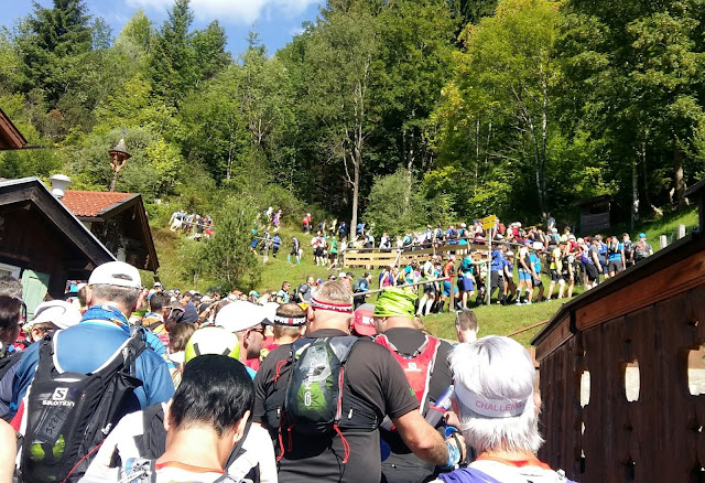 Der Startschuss fällt - und wir setzen uns in Bewegung. Zunächst im Schritttempo, dann im langsamen Trab. Auf den ersten 600 Metern geht es durch Mittenwald, bevor wir dann für 37 km den Asphalt hinter uns lassen. Einige Zuschauer – Betreuer wie zufällige „Zaungäste“ – jubeln uns zu. Es geht in Richtung Kurpark, wo der erste Aufstieg beginnt. Und wo der Stau auf uns wartet. Hier geht kurz mal nichts mehr, denn die breite Straße verjüngt sich in einen schmalen Weg. Katrin und ich schauen uns um. Wir sind doch tatsächlich die Letzten! Hinter uns ist nur noch die Feuerwehr, und die „Besenfrau“, die jetzt schon die Wegmarkierungen wieder einsammelt.